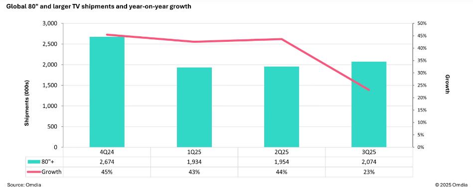 中国的放缓也影响了80英寸及以上分支市场的增长速度,其扩张幅度从去年每季度超过40%几乎减半,到2025年第三季度仅为23.1%。70-79英寸品类也有所降温,同比仅增长1.1%。这给中国品牌带来了战略上的两难境地,这些品牌在北美和中国等关键市场一直专注于低成本的大屏幕电视。随着注意力转向欧洲和亚洲与大洋洲,平均尺寸偏好要小得多——2025年第三季度,中国的平均尺寸为62.8英寸,而亚洲与大洋洲仅为45.5英寸。
